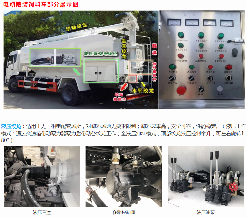 液壓式散裝飼料車的飼料罐架設在卡車的底盤上,專用設施由罐體總成、輸送系統(水平卸料系統、垂直卸料系統以及活動卸料系統組成)、液壓系統(高壓油泵經管路與分配閥連接該閥的三個輸出端分別是轉角液壓馬達、升降油缸以及串聯在一起的水平卸料、垂直卸料、活動卸料液壓馬達)、電動系統、氣動分倉機構等組成。在罐體底部設有閘門,在閘門下面裝有水平螺旋輸送器(俗稱水平攪籠),由取力器由汽車變速箱輸出動力驅動,再傳動高壓油泵以驅動液壓系統,液壓馬達通過傳動裝置帶動水平螺旋輸送器的葉片軸及葉片旋轉, 經活動輸送系統(俗稱活動攪籠)以將飼料輸出。車頂平置的一根活動卸料絞龍可自由回轉和抬升,運輸時,頂部的螺旋管平臥在罐頂;卸料時則抬起,使管端的出料口與畜禽飼養場貯料罐頂部的進料門相接、對準,完成卸料。電動絞龍散裝飼料運輸車是針對不同客戶群最新研發的、滿足低端市場的新產品,該車不配車載發電機,電動絞龍利用市電三相380V來供電,車輪距較小能適應農村鄉間道路。該車性價比高很受客戶的青睞,適用于路況狹小的小型養殖場、飼料廠。采用機械螺旋的卸料方式,卸料速度快,可連續作業,大大提高生產效率。罐體可分隔成二至四倉,同時裝載不同飼料;各部件結構簡單,操作方便靈活,易于維修保養。