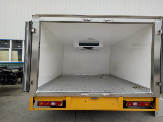 冷藏車廂體:采用國標(biāo)A級聚氨酯保溫材料,厚度為8厘米,廂體內(nèi)外采用玻璃鋼材質(zhì)全包裹。不銹鋼鎖件。包角、包邊鋁合金型材。底盤采用高強(qiáng)度花紋鋁板定制。可選裝肉鉤導(dǎo)軌,和底部通風(fēng)槽。廂體材質(zhì)為內(nèi)外玻璃鋼,中間夾層采用5個厚聚氨酯發(fā)泡隔熱材料,廂體一次成型,底板為花紋鋁板,門框邊飾全不銹鋼件,后門雙開。