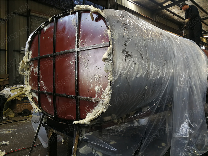 3. 保層溫的制作是在水罐外部另外焊接10mm厚的支撐骨架,然后用保溫材料將骨架內(nèi)部填充滿,**在骨架外蒙上一層外皮。 保溫層外表鐵皮采用8mm厚高強(qiáng)度耐磨板,可選擇使用不銹鋼分鏡面8K或磨砂板