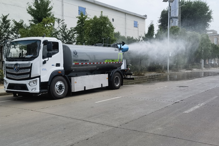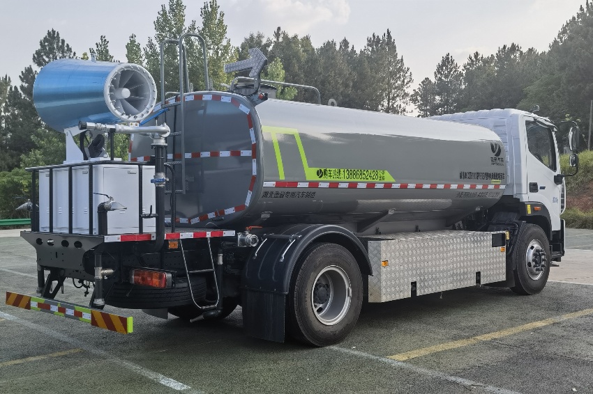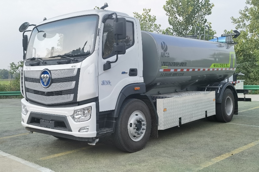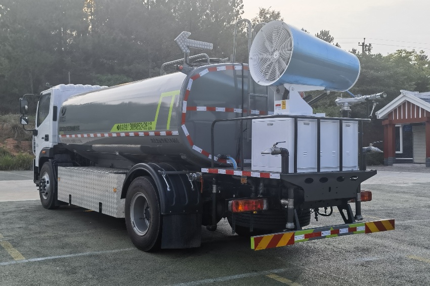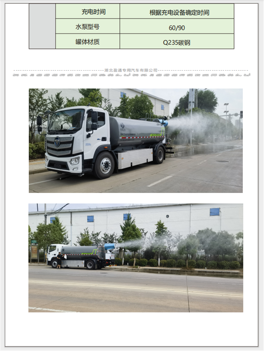 福田歐航灑水車(chē)_電動(dòng)霧炮車(chē)_純電動(dòng)灑水車(chē),京牌13噸灑水車(chē),湖北盈通專(zhuān)用汽車(chē)有限公司,該車(chē)主要用于城鄉(xiāng)園林綠化,路面噴灑;主要裝置為罐體及噴灑裝置.罐體總?cè)萘?10.6立方米;罐體有效容積10.1立方米;介質(zhì):丙酮水溶液,密度950千克/立方米,罐體外形尺寸(長(zhǎng)×長(zhǎng)軸×短軸)(mm):4600×2300×1450.側(cè)防護(hù)采用電池護(hù)罩代替,材料為Q235碳鋼,螺栓連接;后防護(hù)材料為:Q235碳鋼,連接方式為:螺栓連接,后部防護(hù)截面尺寸(mm):120×50,后部防護(hù)離地高度(mm):490;ABS型號(hào)/生產(chǎn)企業(yè):ABS-E/采埃孚商用車(chē)系統(tǒng)(青島)有限公司;電池種類(lèi):磷酸鐵鋰電池,儲(chǔ)能裝置單體生產(chǎn)企業(yè):寧德時(shí)代新能源科技股份有限公司,儲(chǔ)能裝置總成生產(chǎn)企業(yè):寧德時(shí)代新能源科技股份有限公司;電機(jī)型號(hào)/生產(chǎn)企業(yè):TZ375XSSF-SZF611/陜西法士特齒輪有限責(zé)任公司,額定功率:105kW,峰值功率:175kW.選裝前部電子水炮樣式,選裝前部不帶電子水炮,該狀態(tài)下車(chē)長(zhǎng)為8100mm;當(dāng)前部安裝電子水炮時(shí),車(chē)長(zhǎng)為8600mm,車(chē)輛前伸500mm.后部箭頭指示燈僅在車(chē)輛作業(yè)時(shí)開(kāi)啟.選裝車(chē)輛前部鴨嘴裝置.選裝噴灑裝置樣式.選裝管道口位置. |